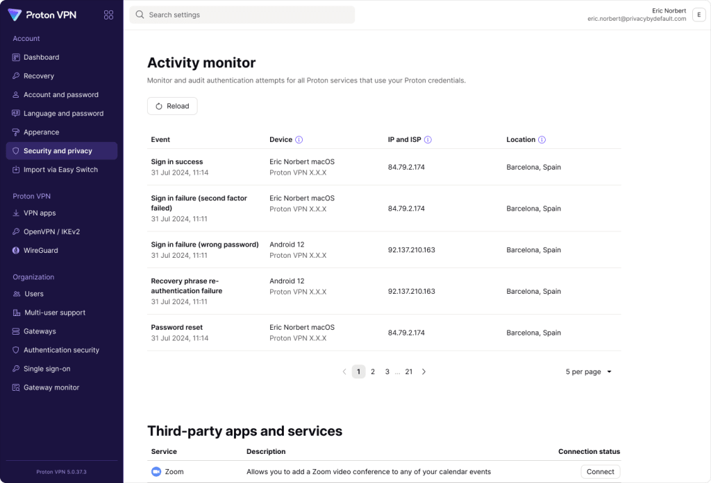 Account monitor gives Proton for Business organizations visibility over sign-in attempts and other account management events. Users can view events for their own account, and administrators can view events for their whole organization to track suspicious behavior like unauthorized access attempts or credential misuse.