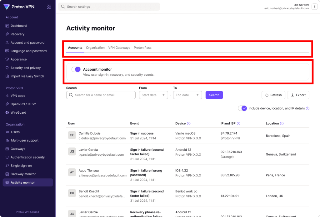 - Account monitor: Shows authentication, sign-in, and account management events. Available with Proton Business Suite and all Proton for Business plans at the Professional tier.