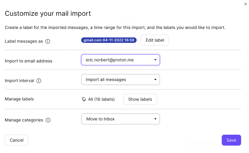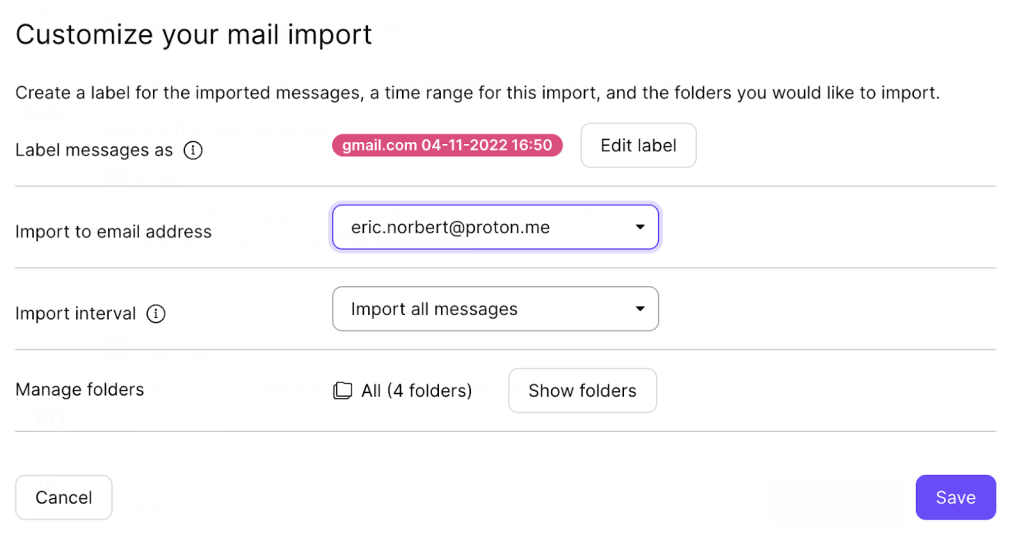 - Label of the imported messages in your Proton Mail account.