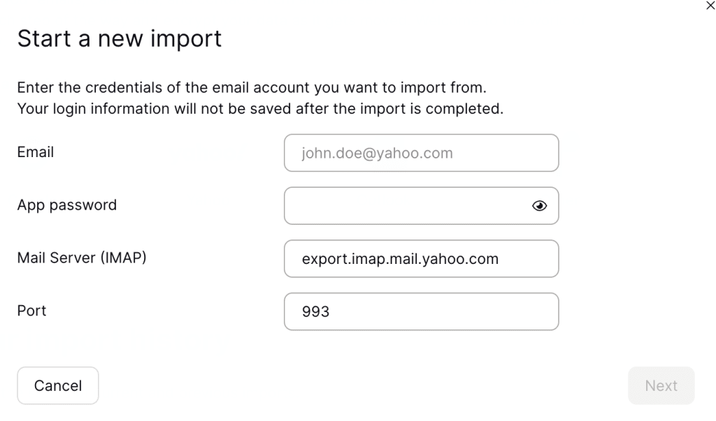 You’ll be asked to enter the email address and password for the external email account you are exporting from. This allows Proton Mail to access your data so that we can import it into your Proton Mail account. We delete your login details once the import is complete. See our privacy policy for more details.