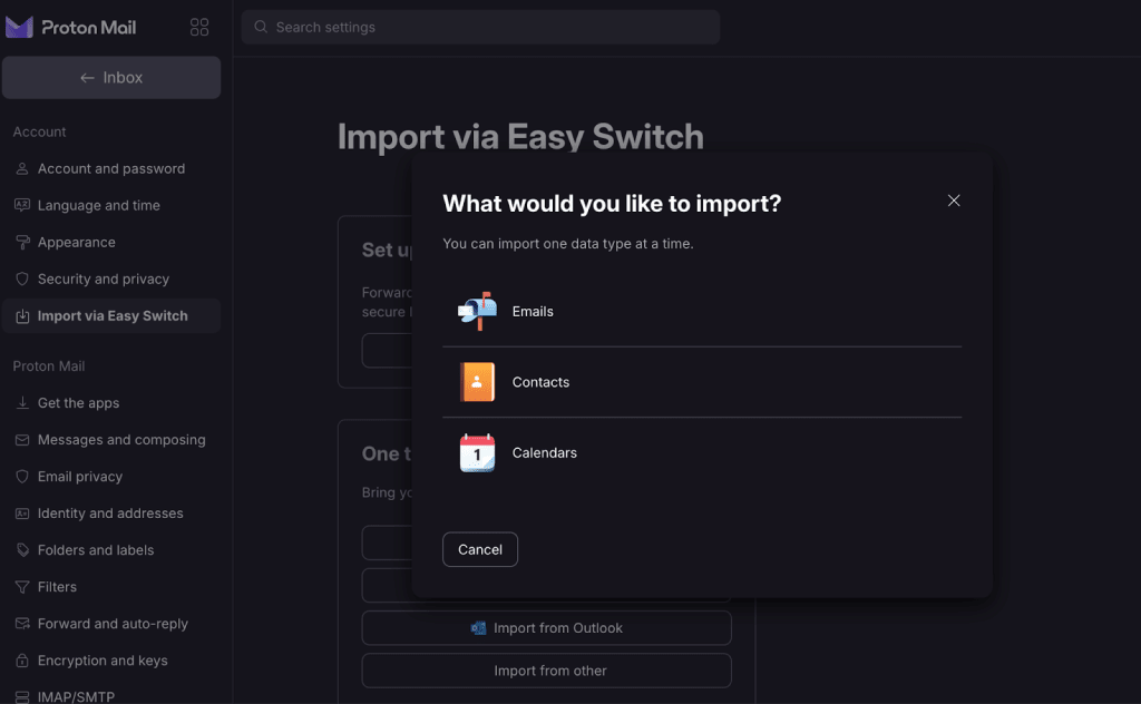 Easy Switch is fully integrated into Proton Mail, and you can import emails from any email service provider that uses IMAP. Depending on the provider, you can also import your calendars and contacts.