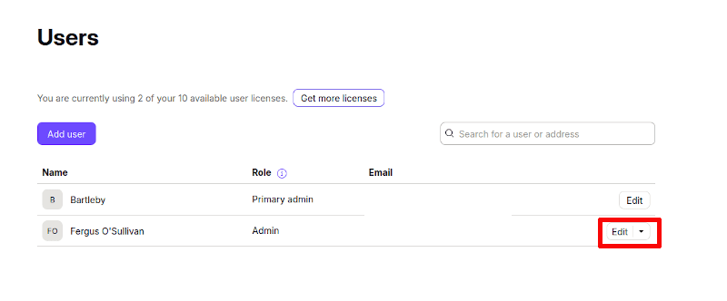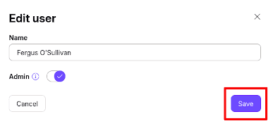 To edit a user’s name and admin status, click on the Edit button to the right of their name.