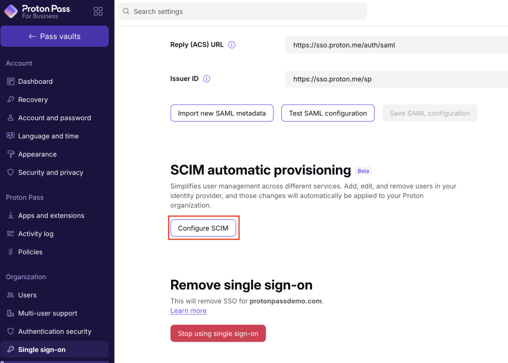 1. Log in to your Proton Pass for Business administrator account and go to ⚙ → Organization → Single sign-on → SCIM automatic provisioning → Configure SCIM.