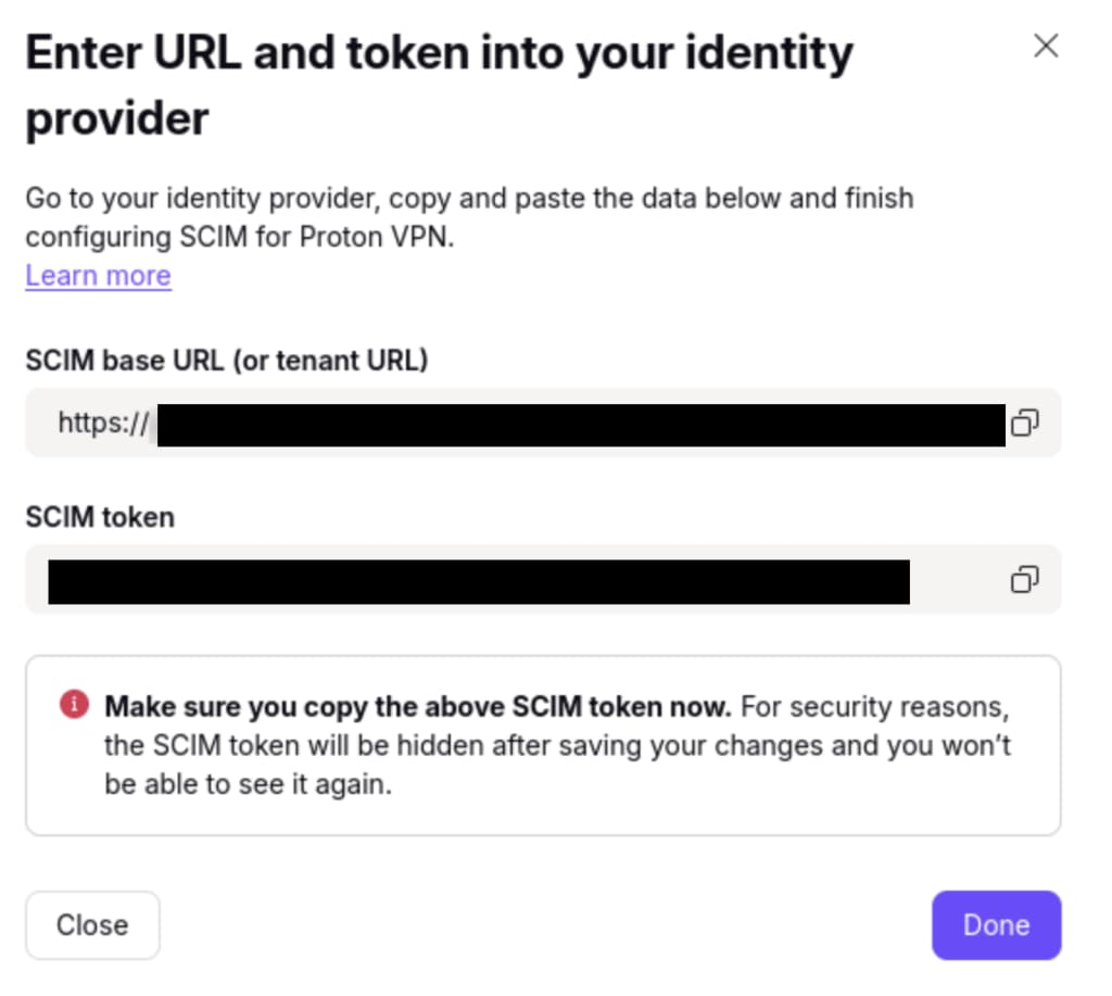 2. Make a note of the SCIM base URL and SCIM token. Click Done when you’re ready.