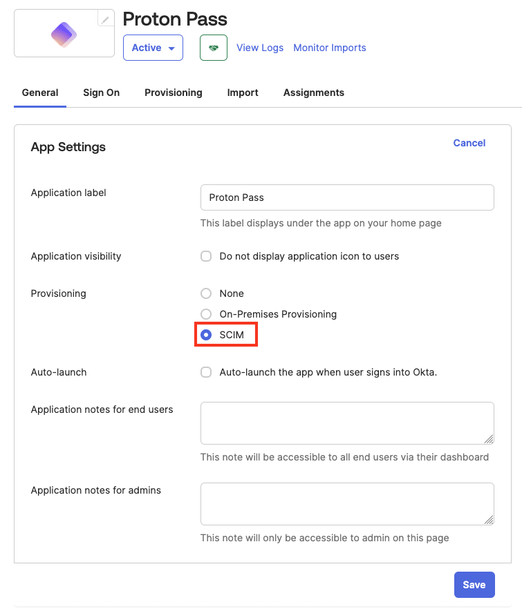 4. Go to the Applications tab → Applications → Proton Pass → Edit. Under Provisioning select SCIM → Save.