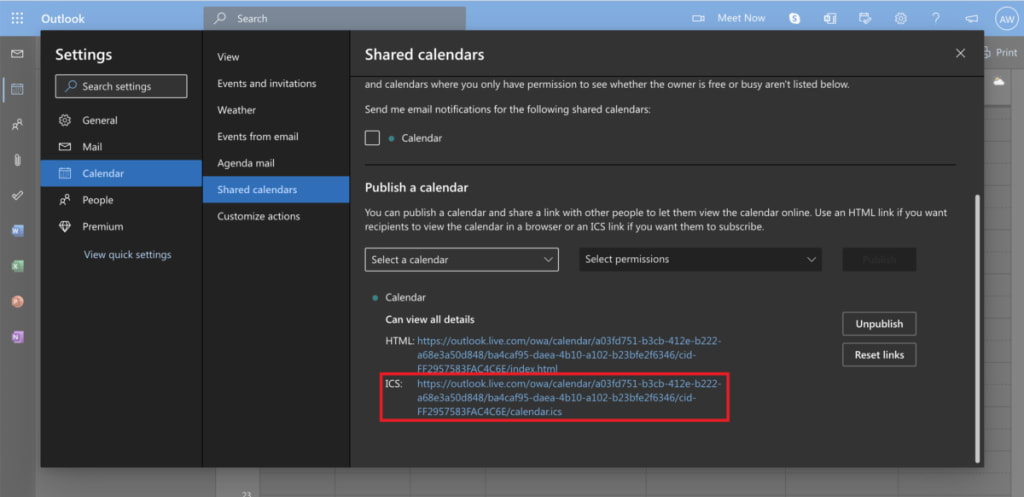 - Copy the link in the ICS field. This link can be added to Proton Calendar using the instructions below.