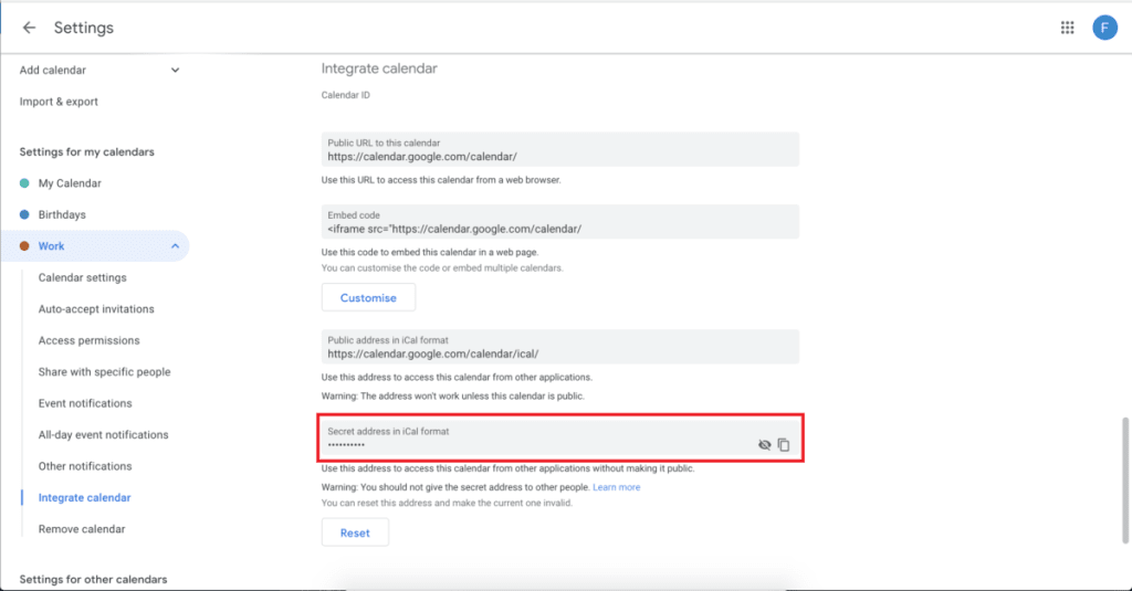 - Scroll down to Integrate calendar and copy the link in the Secret address in iCal format field. This link can be added to Proton Calendar using the instructions below.