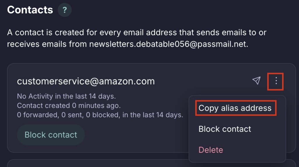 - If you’d prefer not to automatically open your default client and would prefer to copy and paste the reverse alias created to send an email, you can also select the three dots ⋮ icon to directly copy your reverse alias address and paste it into an app or browser of your choice.