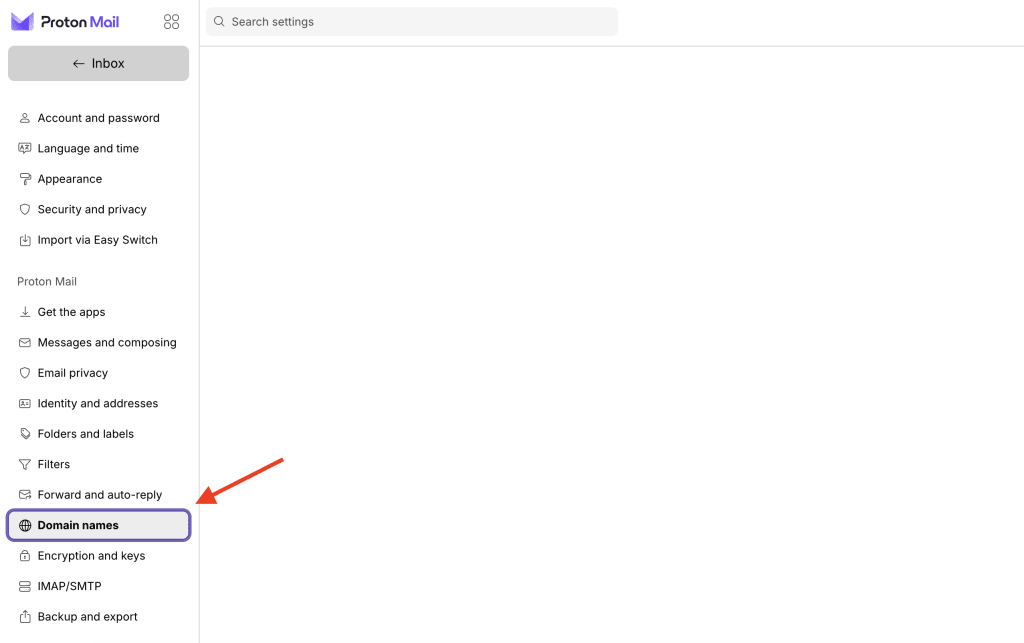 1. In your browser, log in to your Proton Mail account (https://mail.proton.me) and select Settings → All settings → Proton Mail → Domain names → Add domain.
