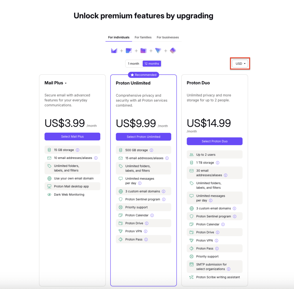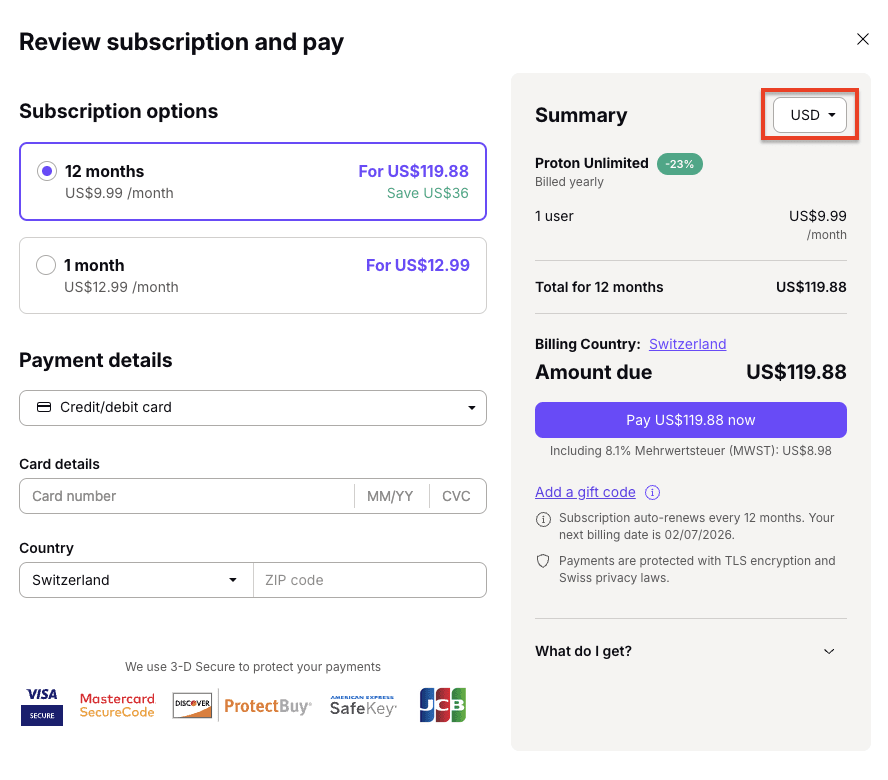 If you have a paid Proton plan, you can choose which currency you want to use to pay: euros (EUR), US dollars (USD), or Swiss francs (CHF).