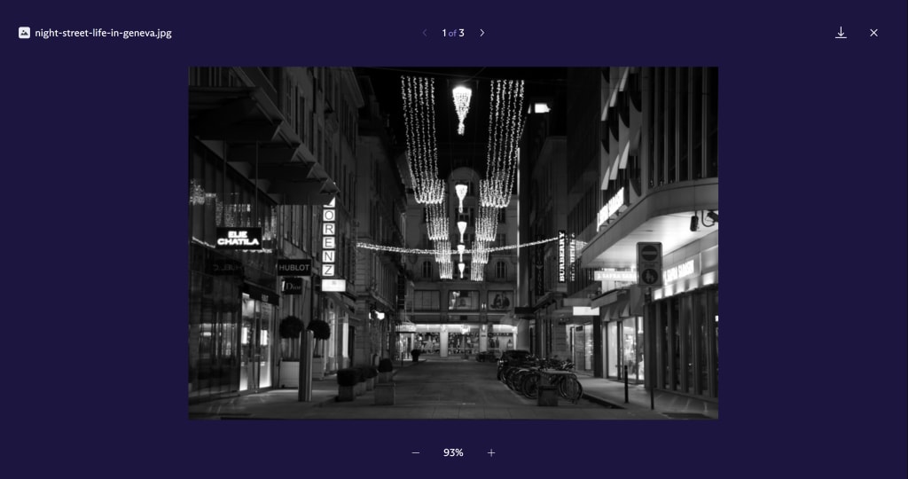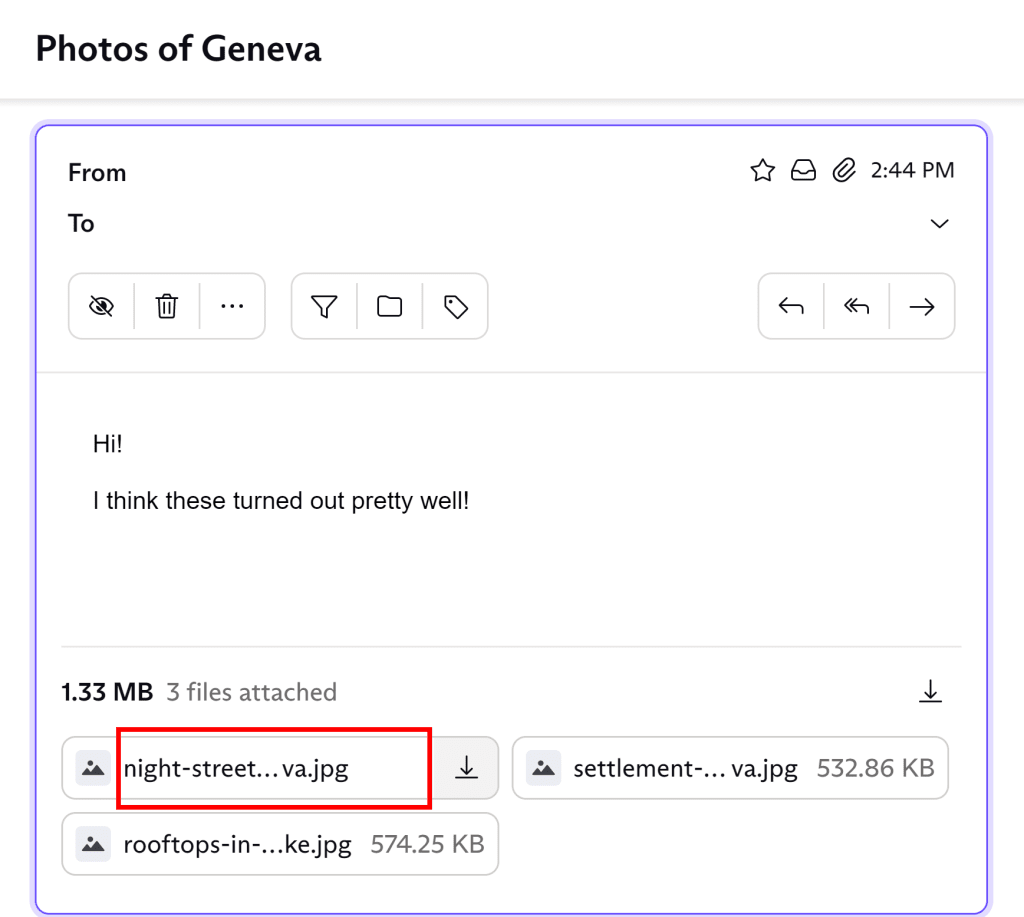 You can use the arrow buttons at the top of the preview to scroll through all that email’s attachments. You can also zoom in, zoom out, or click the download icon to download the file you are currently viewing. Click the cross in the top-right corner to close the preview window.
