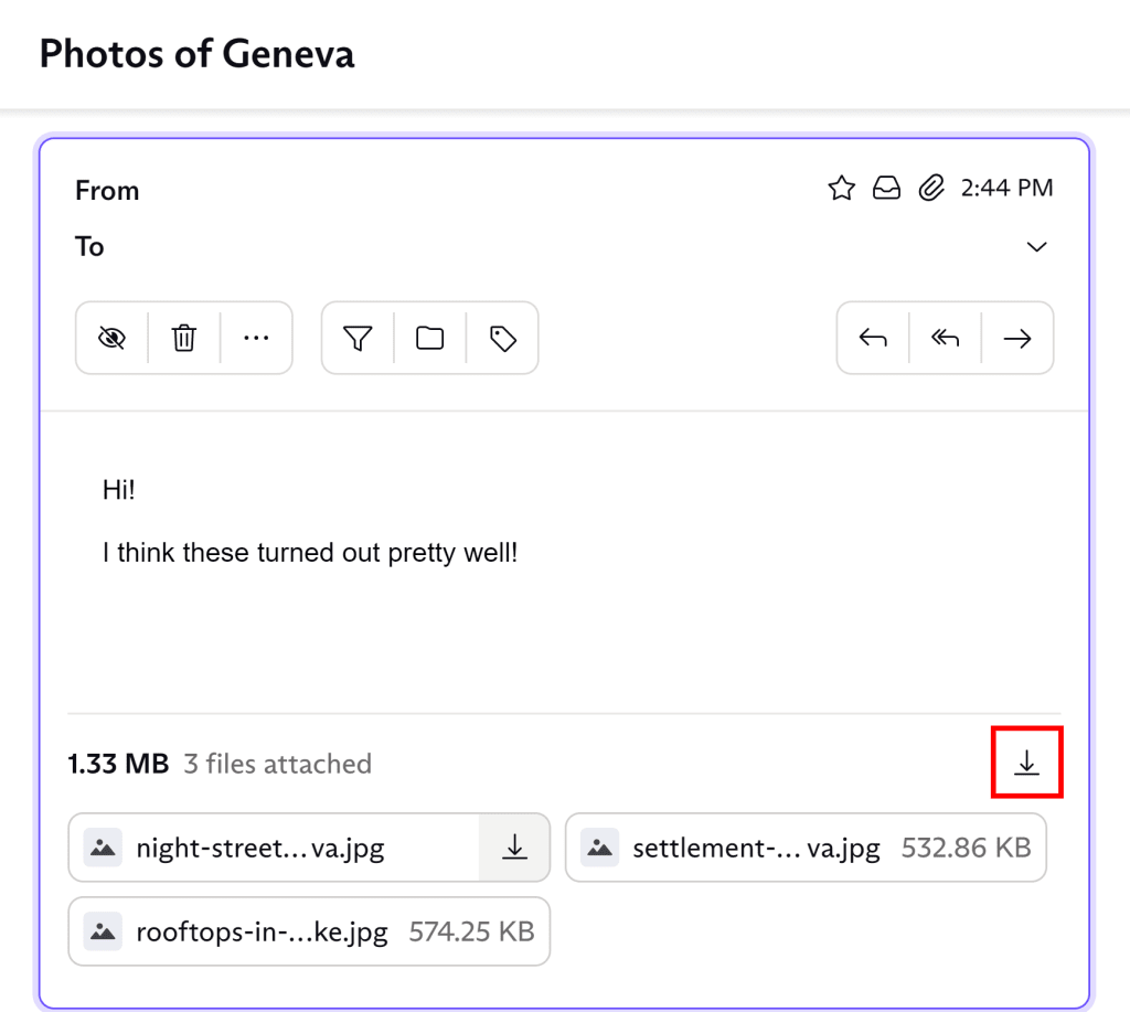 To download all an email’s attachments at once, click the download icon at the bottom right. This will compress all the attachments into a ZIP file and download it onto your device. You can then extract the files to access them.