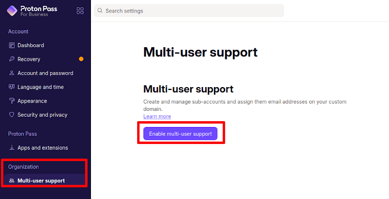 To access all the features of Proton Pass for Business, you’ll need to enable support for multiple users.