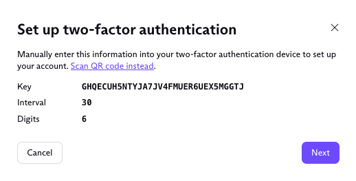 Or you can also enter the 2FA key into your authenticator app manually if you prefer.