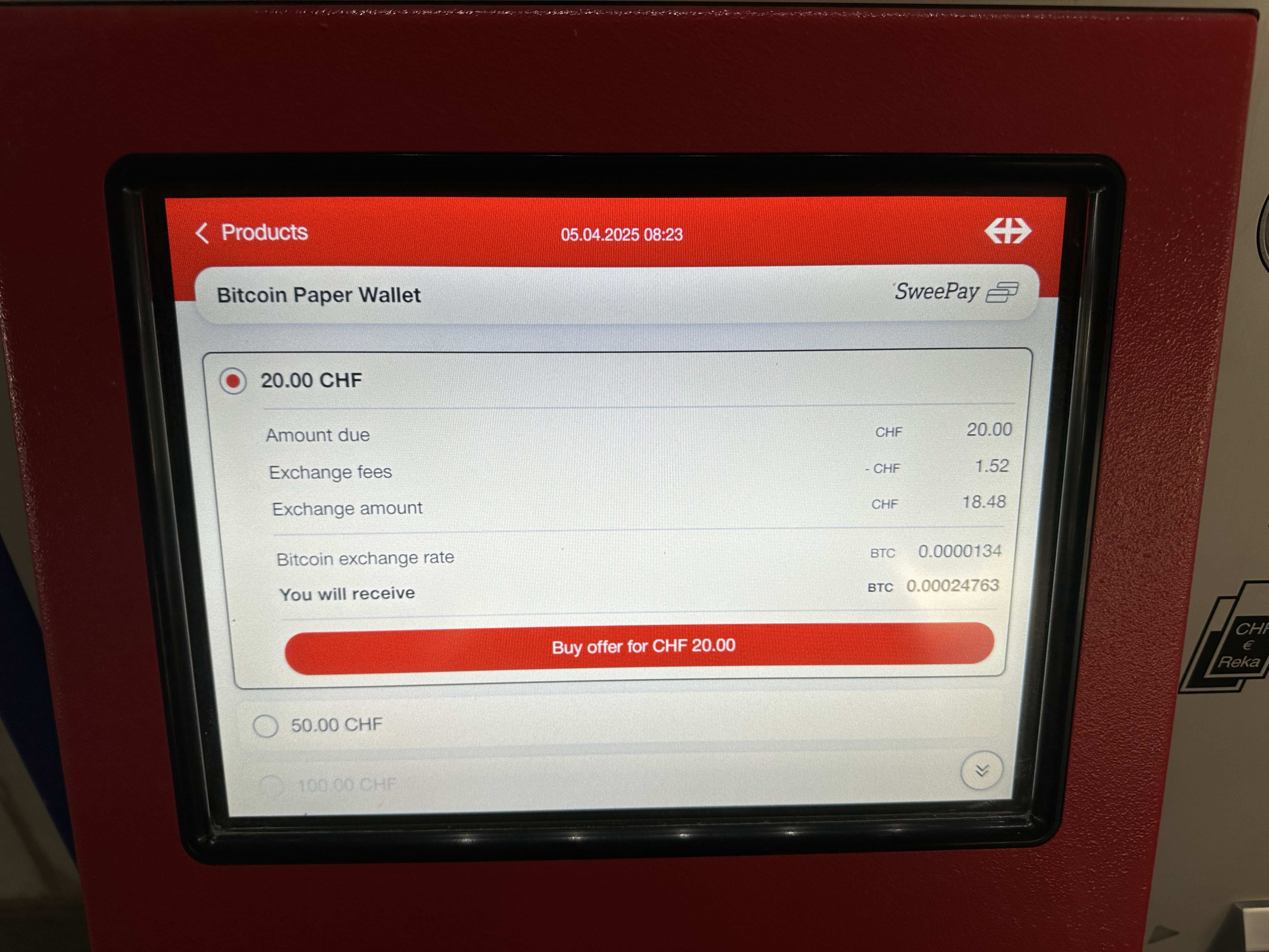 Anyone in Switzerland can easily buy BTC and create a paper wallet using an SBB ticket machine(new window).