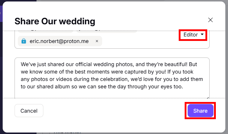 You can follow the same steps as when creating a shared album — just select Editor instead of Viewer when choosing the recipient’s permission level.