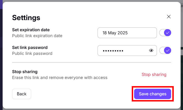 - Go to the settings tab to optionally set an expiration date and link password, the click Save changes.