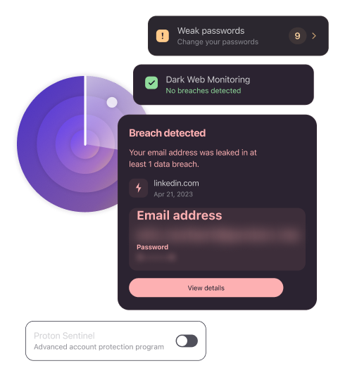 Som en del av vår säkerhetsfunktion Pass Monitor, skannar Övervakning av dark web kontinuerligt onlinedatabaser efter förekomster där dina e-postadresser — och all tillhörande information, såsom kreditkortsdetaljer — har exponerats i dataintrång. Detta tillämpas på Protons 19 e-postdomäner (som @pm.me eller @protonmail.ch) och, för betalda paket, på anpassade e-postdomäner med ditt samtycke. Om dina data avslöjas får du en snabb varning, vilket låter dig agera snabbt för att förhindra identitetsstöld eller obehörig åtkomst.
