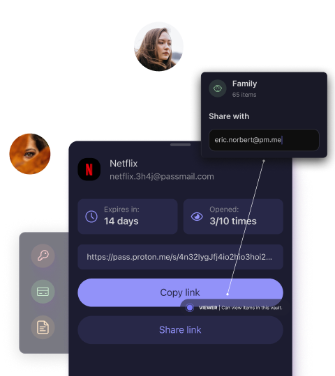 Dela lösenord säkert, kreditkort eller anteckningar med andra, även om de inte använder Proton Pass. Dela enskilda objekt via end-to-end-krypterade länkar, eller bevilja åtkomst till valv via e-post, med alternativ för att ställa in utgång, begränsa visningar, kontrollera åtkomst och återkalla den när som helst.