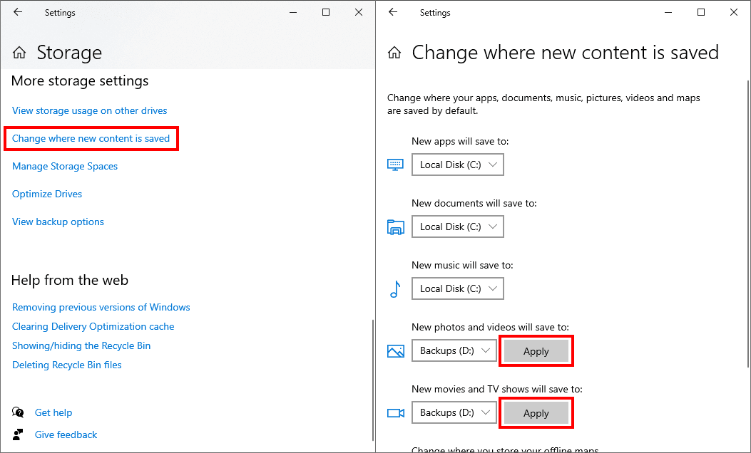 - If your operating system drive is low on space but another local disk has plenty available, click Change where new content is saved. You can set new default locations for apps, documents, music, photos and videos, movies and TV shows, and offline maps — helping prevent your system drive from filling up too quickly.