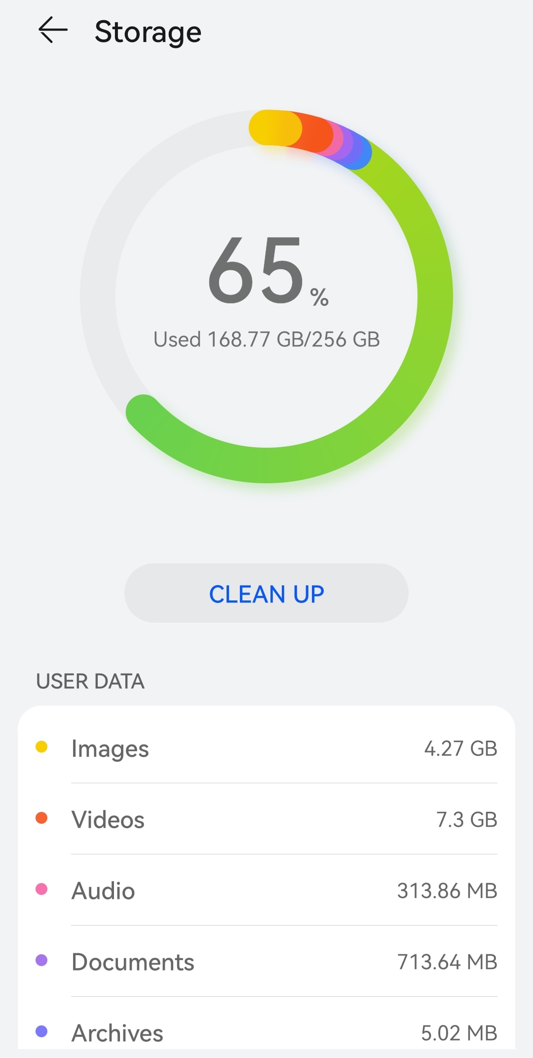 - Go to Settings → Storage. You’ll see categories like Images, Videos, Audio, and Documents.