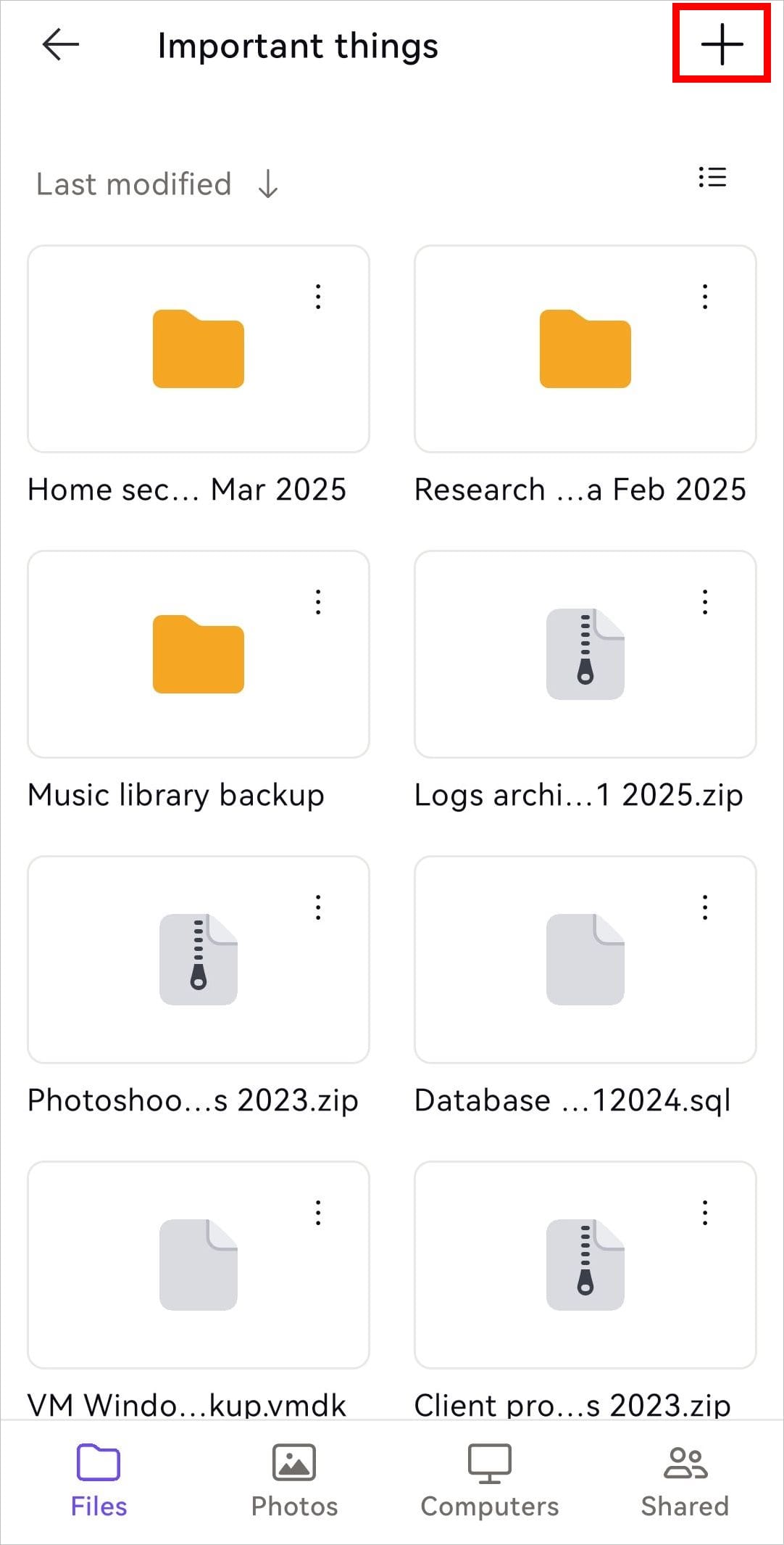 - Manually upload files and folders from your phone by tapping + and selecting items.