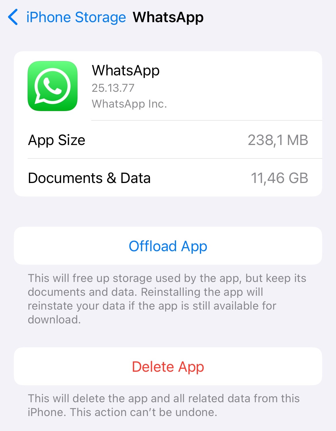 - Go through each app — especially the large ones — and, depending on what you still need, select Offload (removes the app but keeps its data) or Delete (removes both the app and its data).