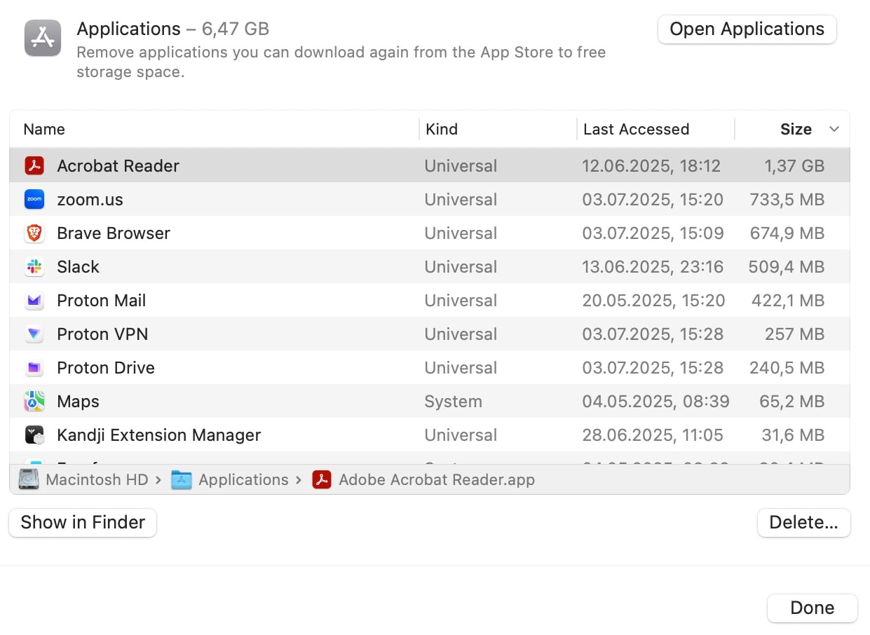 - Select the i icon next to Applications, sort the apps by size, and delete the large ones you don’t need.