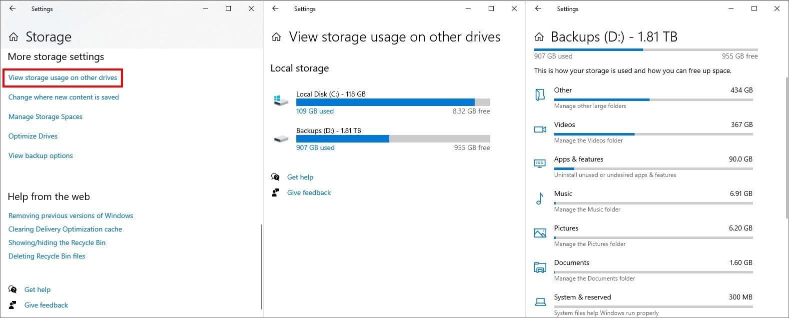 - Once you’ve reviewed the operating system drive, click View storage usage on other drives to see a list of all available drives. Select another drive to check what’s taking up space there and repeat the same cleanup steps if needed.