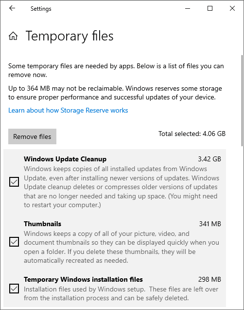 - Open Temporary files, select everything except Downloads — including Windows Update Cleanup, temporary Windows installation files, and thumbnails — and click Remove files.