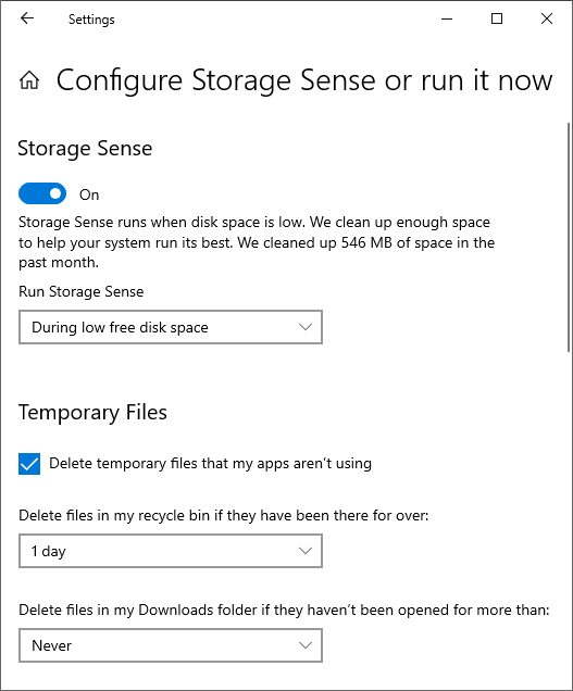 - Turn on Storage Sense to automatically delete unnecessary files such as temporary items and Recycle Bin contents. When disk space is low, you can also configure settings such as running Storage Sense, and removing files older than 60 days from the Downloads folder. If you’re using the Proton Drive desktop app, you can also set unopened files to become online-only, which moves them to the cloud and frees up local space.