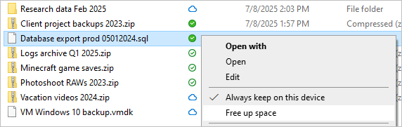 - You can right-click files to make them online-only (stored in the cloud, not on your device) or available offline (downloaded to your device).