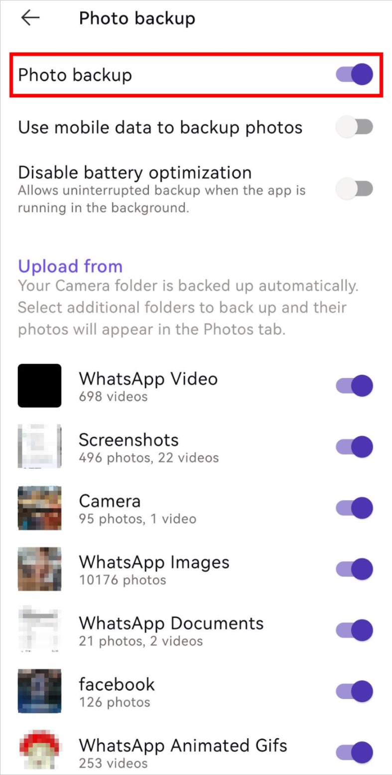- In the app settings, turn on automatic photo backup for your Camera, Screenshots, or other folders. Proton Drive will securely back up your media in the background.