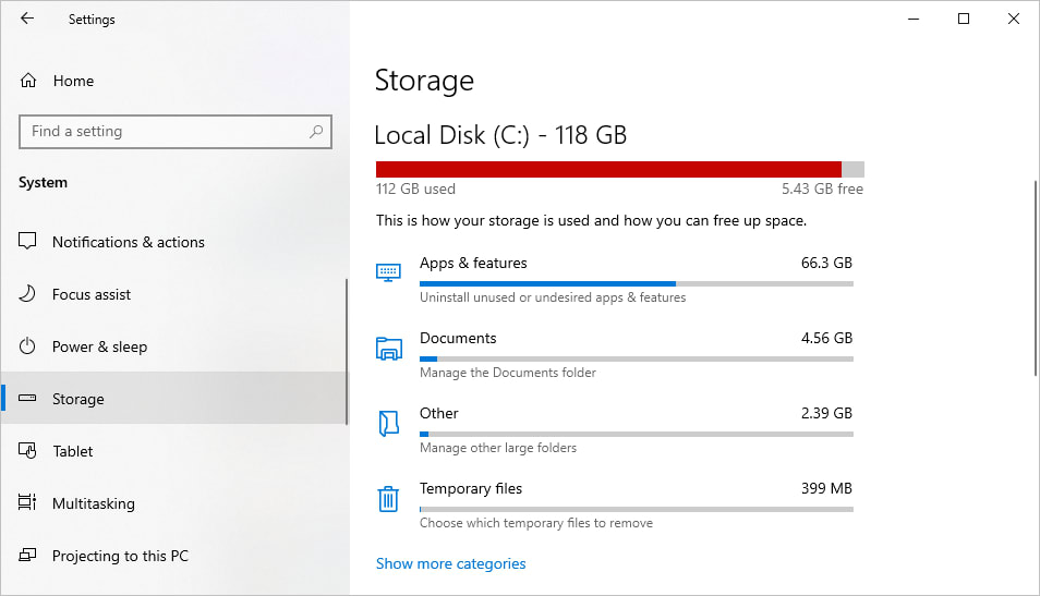 - Go to Settings → System → Storage. By default, Windows shows storage details for the local drive where the operating system is installed (usually the C: drive), including how much space is used by apps, documents, and temporary files.