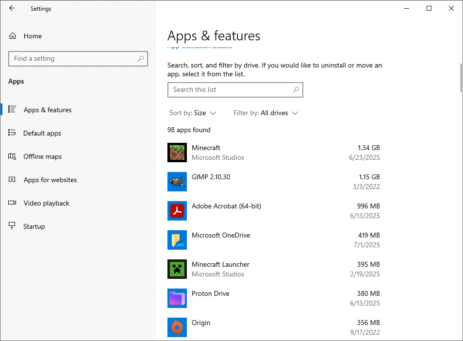 - Select Apps & features, sort by size, and uninstall large applications you no longer use.