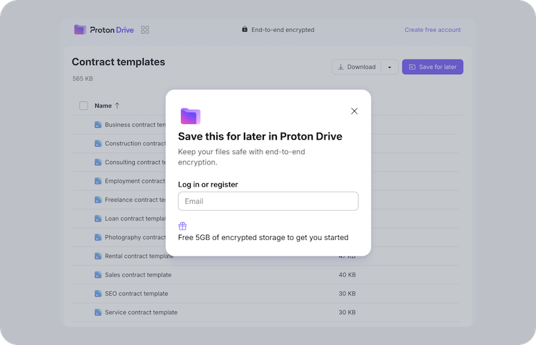 With our cloud storage for business, you can easily customize and share contract templates. Create a Proton Drive account and collaborate securely with your team.