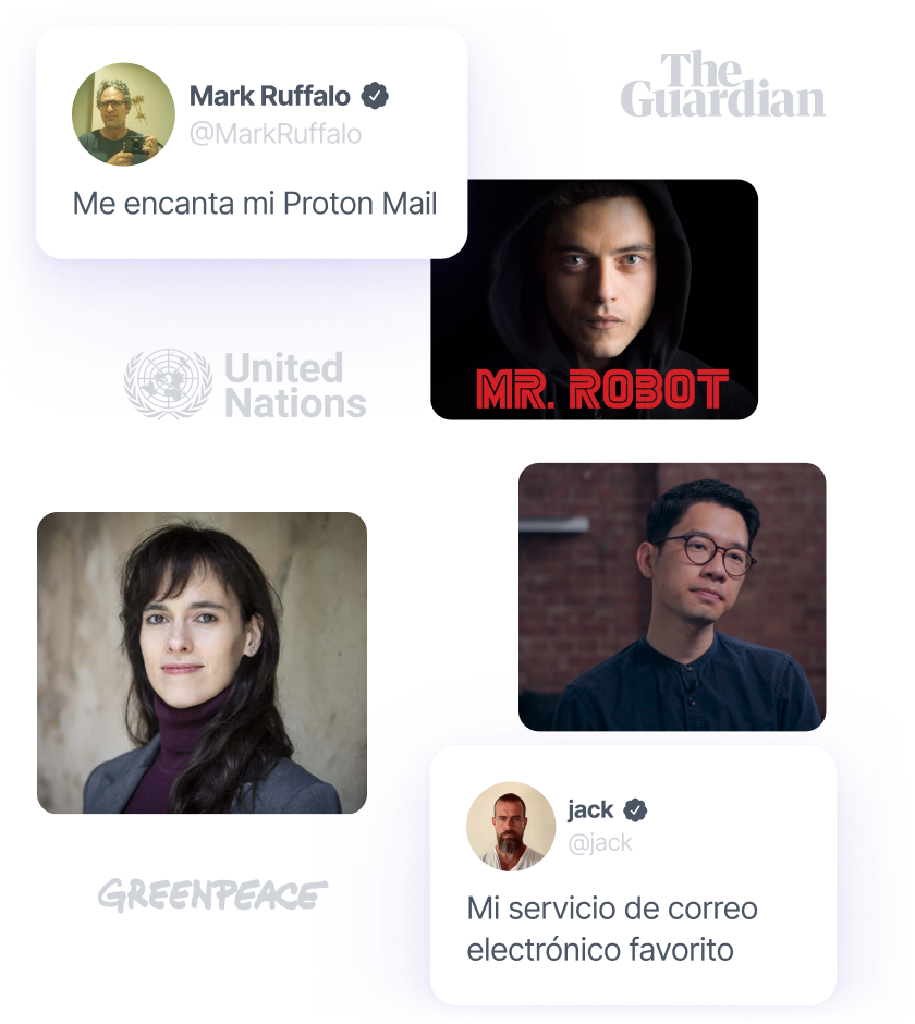 Proton Mail es la elección de confianza para una disfrutar de una comunicación segura y privada, por ejemplo, para salas de prensa, activistas, organizaciones internacionales, académicos, ganadores del Premio Nobel y celebridades del cine. Únase a más de 100 millones de personas en el mundo que creen que vale la pena proteger su privacidad online.